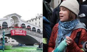 Greta Thunberg colore o Grande Canal de Veneza em protesto climático