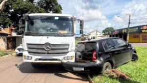 Caminhão atingiu a parte traseira do carro, que foi parar no canteiro da avenida