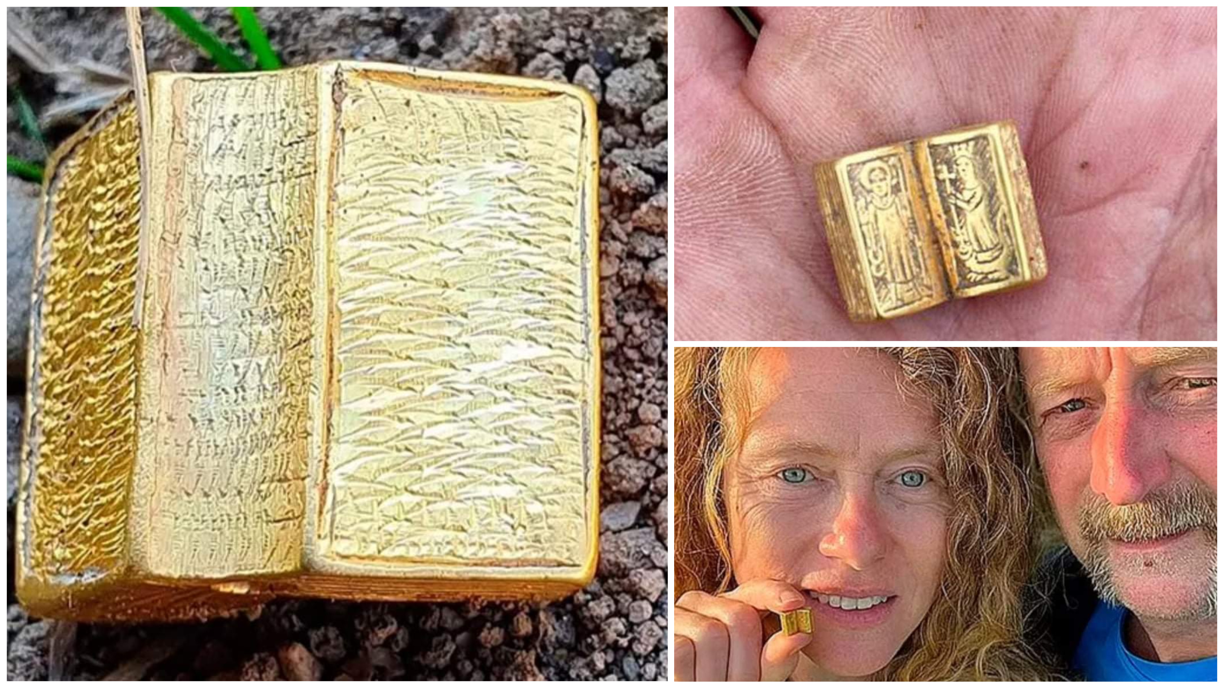 A enfermeira do NHS Buffy Bailey, passeava em uma trilha na companhia do marido na região de York quando seu detector de metais captou um sinal forte perto de uma trilha e não foi preciso cavar mais de 15 centímetros para se deparar com a preciosa bíblia de ouro maciço.