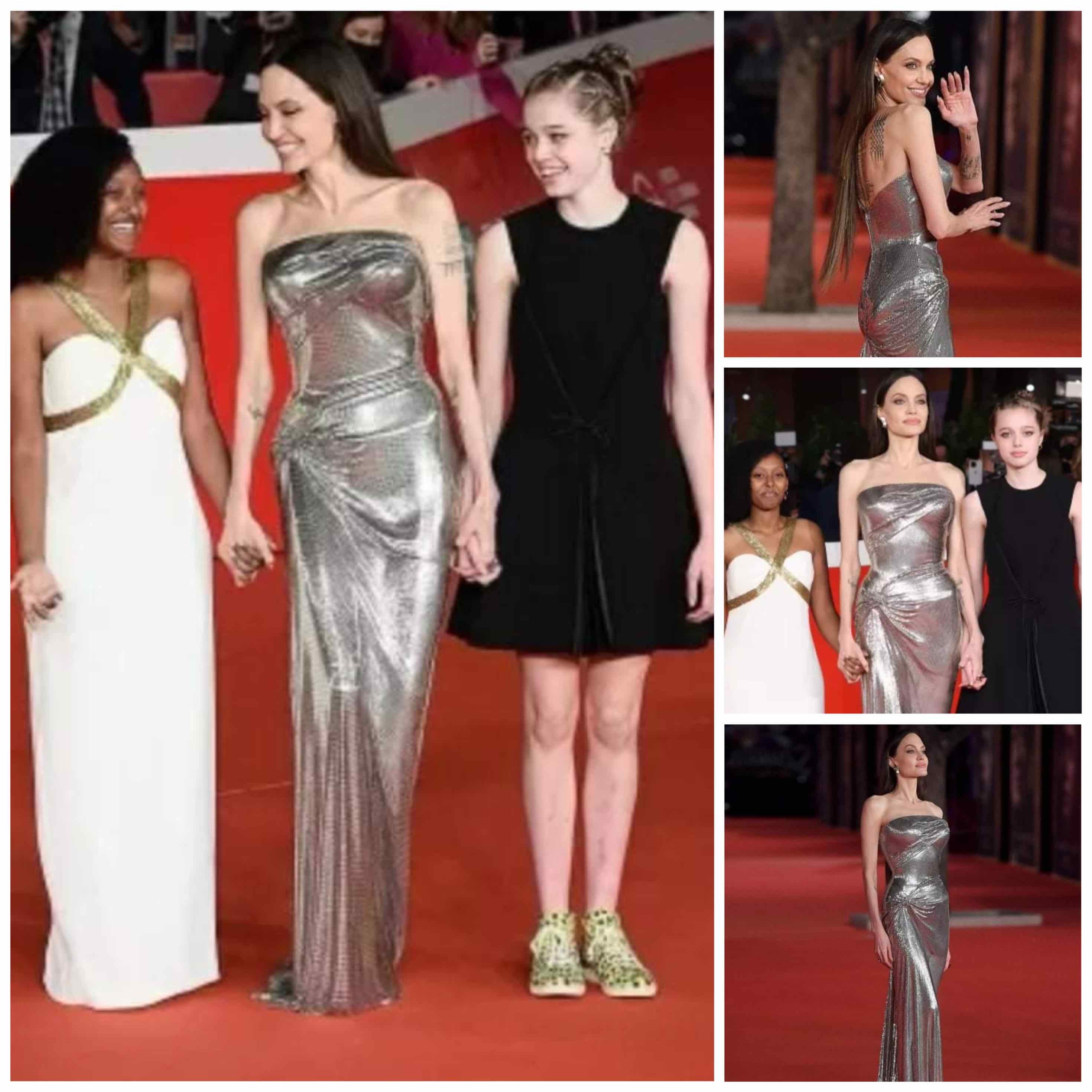 Em 16° Festival de Cinema de Roma, Angelina Jolie brilha ao lado de filhas com vestido metalizado da Versace