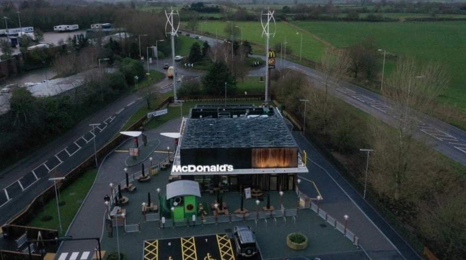 A rede de fast food McDonald’s abriu, nesta sexta-feira (10), seu primeiro restaurante carbono net zero no Reino Unido. A unidade de Market Drayton tem energia gerada por painéis solares e turbinas eólicas, e usa material reciclado da pista do drive-thru até a decoração e sinalização interna da loja.