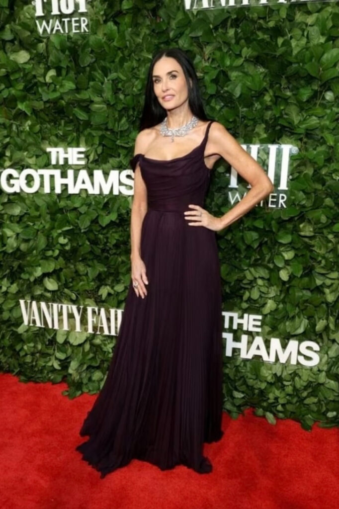 Indicada ao prêmio de Melhor Performance Principal por “A Substância”, Demi Moore apostou em um vestido longo em um tom de roxo mais fechado.