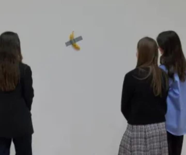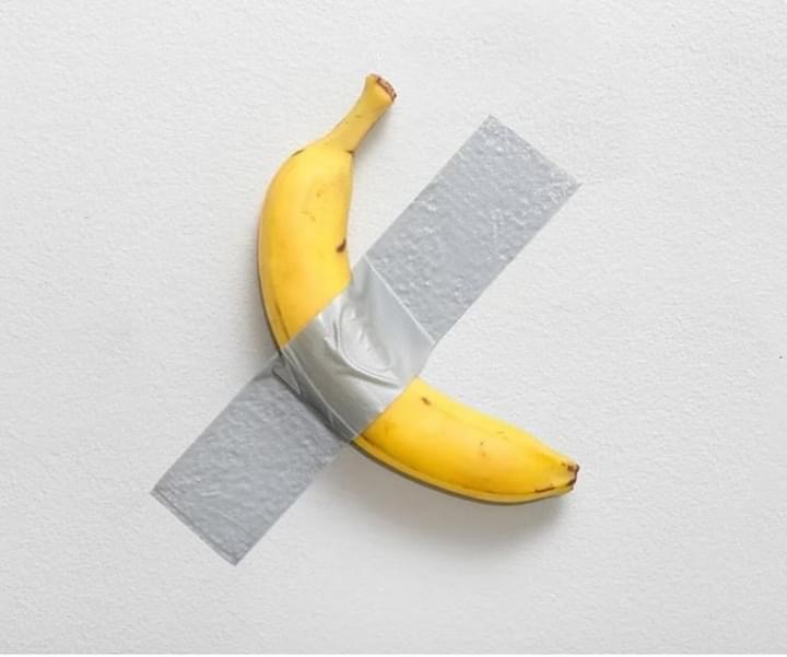 Consistindo apenas de uma banana presa a uma parede branca com fita adesiva, a obra “Comedian”, de Maurizio Cattelan, de 2019, viralizou logo quando surgiu na Art Basel Miami Beach, vendendo três exemplares por até US$ 150 mil cada.