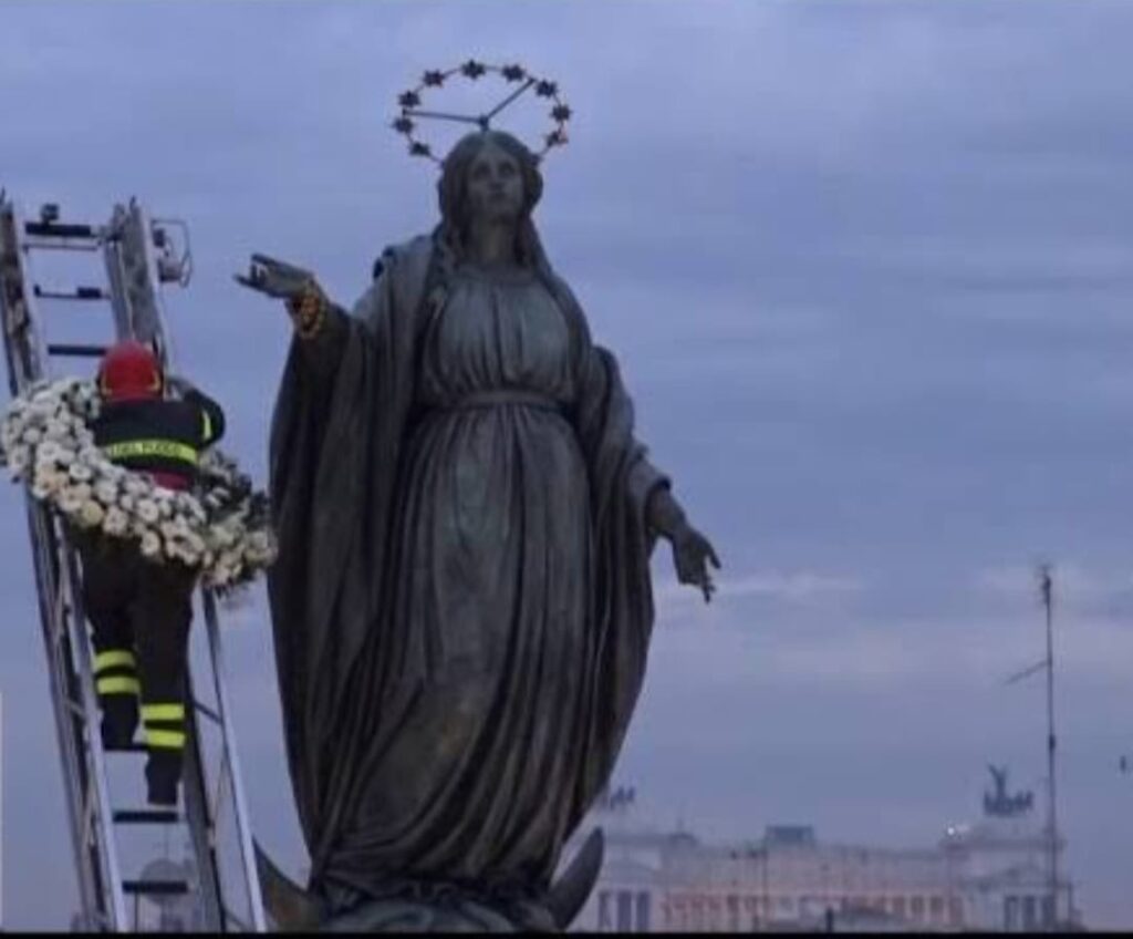Um bombeiro corajoso escalou 27 metros para colocar uma coroa de flores no monumento à Virgem Maria na Piazza Mignanelli, em Roma.