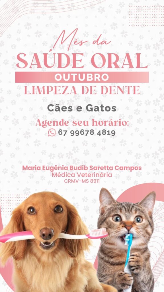 E para incentivar os tutores, nos meses de outubro e novembro, a médica veterinária Maria Eugênia Budib (CRMV-MS 8911) estará realizando o “mês da saúde oral”, com dicas de prevenção, e tratamento para saúde bucal dos pets.