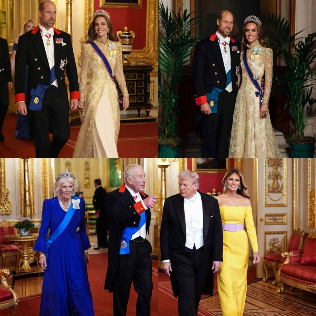 Na ocasião, Kate Middleton usou um vestido de alta costura da estilista britânica Phillipa Lepley com renda chantilly dourada bordada à mão e forro de crepe de seda. Para completar o visual, uma Tiara Lover’s Knot, que era da Rainha Mary e que faz parte do acervo da realeza, e também os brincos que foram da rainha Elizabeth.