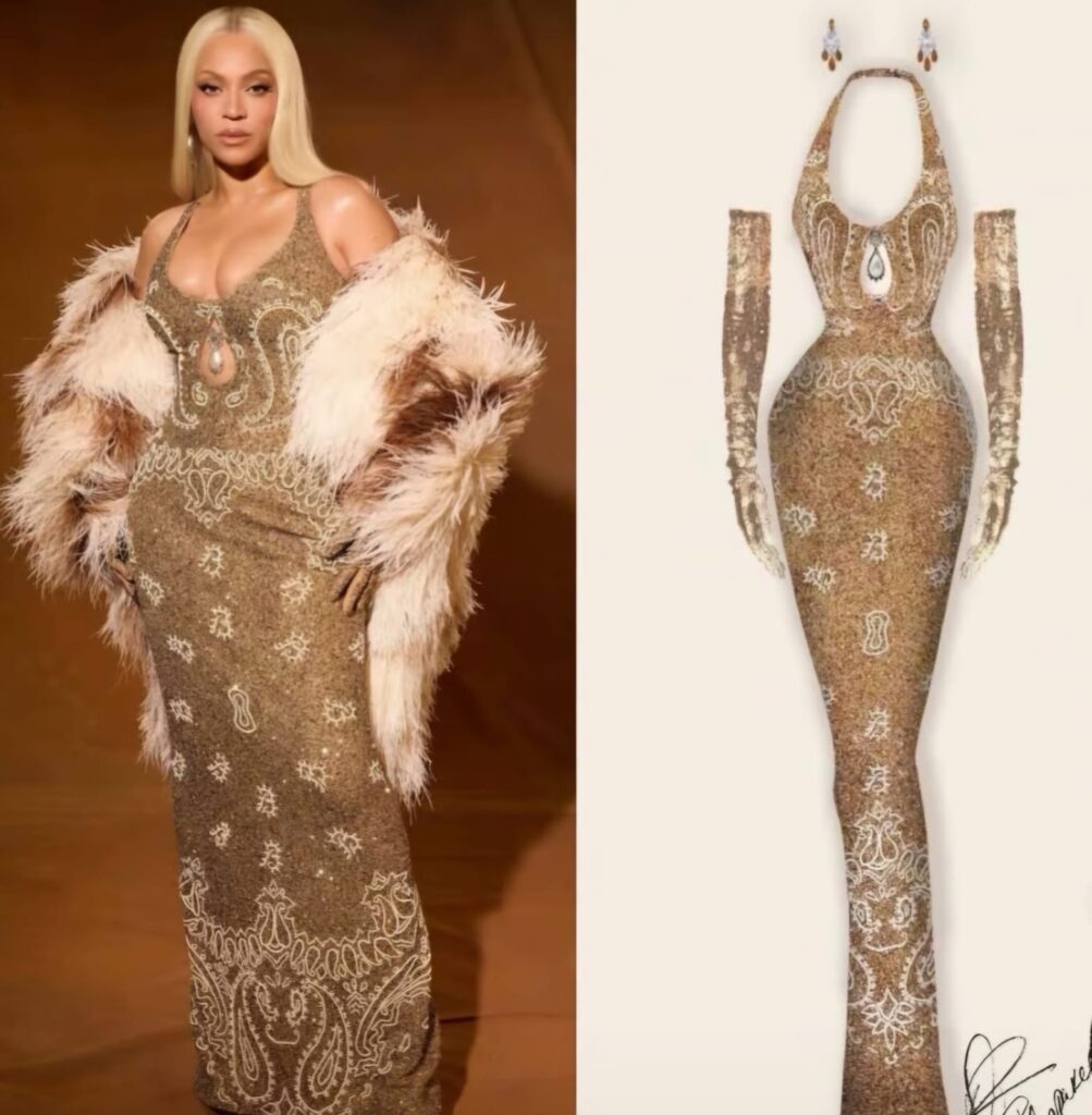 Beyoncé estava brilhando em um vestido personalizado Schiaparelli Haute Couture com miçangas, costurado com um padrão paisley ocidental que lembrava uma bandana. No centro de seu vestido havia um recorte em formato paisley com um detalhe de pérola incrustado de cristal pendurado. Beyoncé usou o vestido com luvas de ópera combinando, brincos de pérola e … Continued