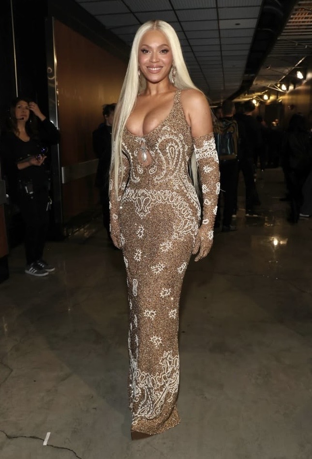 Beyoncé estava brilhando em um vestido personalizado Schiaparelli Haute Couture com miçangas, costurado com um padrão paisley ocidental que lembrava uma bandana. No de seu vestido havia um recorte em formato paisley com um detalhe de pérola incrustado de cristal pendurado. Beyoncé usou o vestido com luvas de ópera combinando, brincos de pérola e salto plataforma de veludo.