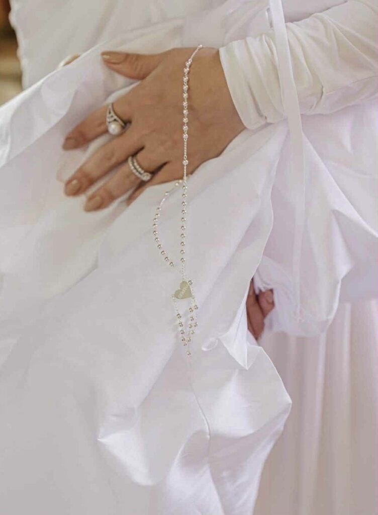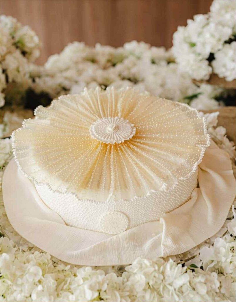 O topo da sobremesa trazia uma delicada renda no estilo tule, com um detalhe central que roubou a cena. Já ao longo da estrutura, pequenas bolinhas em relevo lembravam pérolas, reforçando o ar minimalista e elegante que marcou a comemoração.