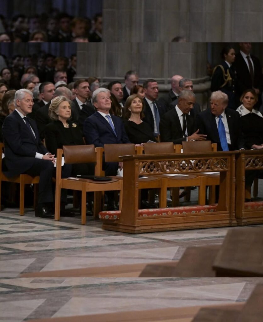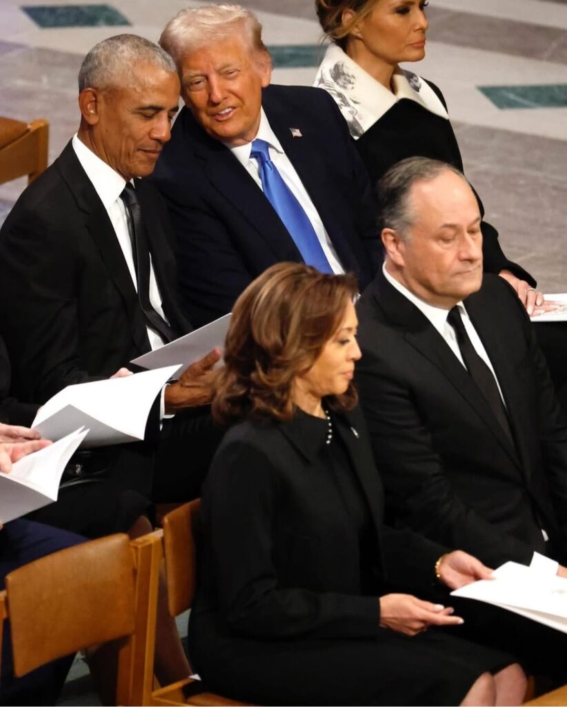 Ex-presidentes dos EUA, Barack Obama, Donald Trump, Bill Clinton e George W. Bush reuniu-se para prestar as suas condolências no funeral de Jimmy Carter, nesta quinta-feira(09), onde Trump também foi visto a reunir-se com o seu antiho VP, Mike Pence. O presidente Joe Biden e a vice-presidente Kamala Harris também estiveram presentes com a primeira-dama Jill Biden e Doug Emhoff, as ex-primeiras-damas Hilary Clinton, Laura Bush e Melania Trump, entre outros.