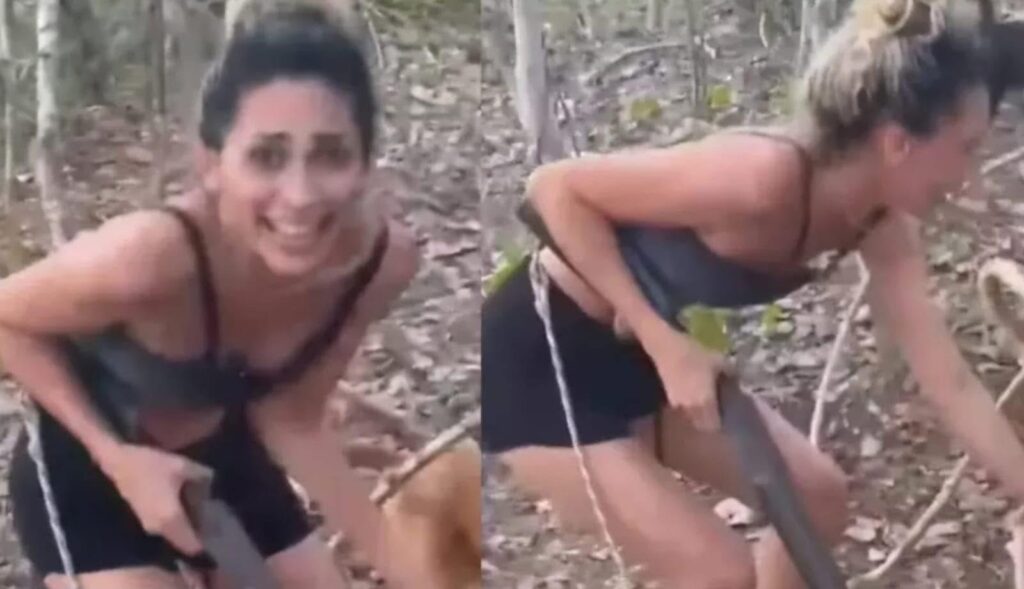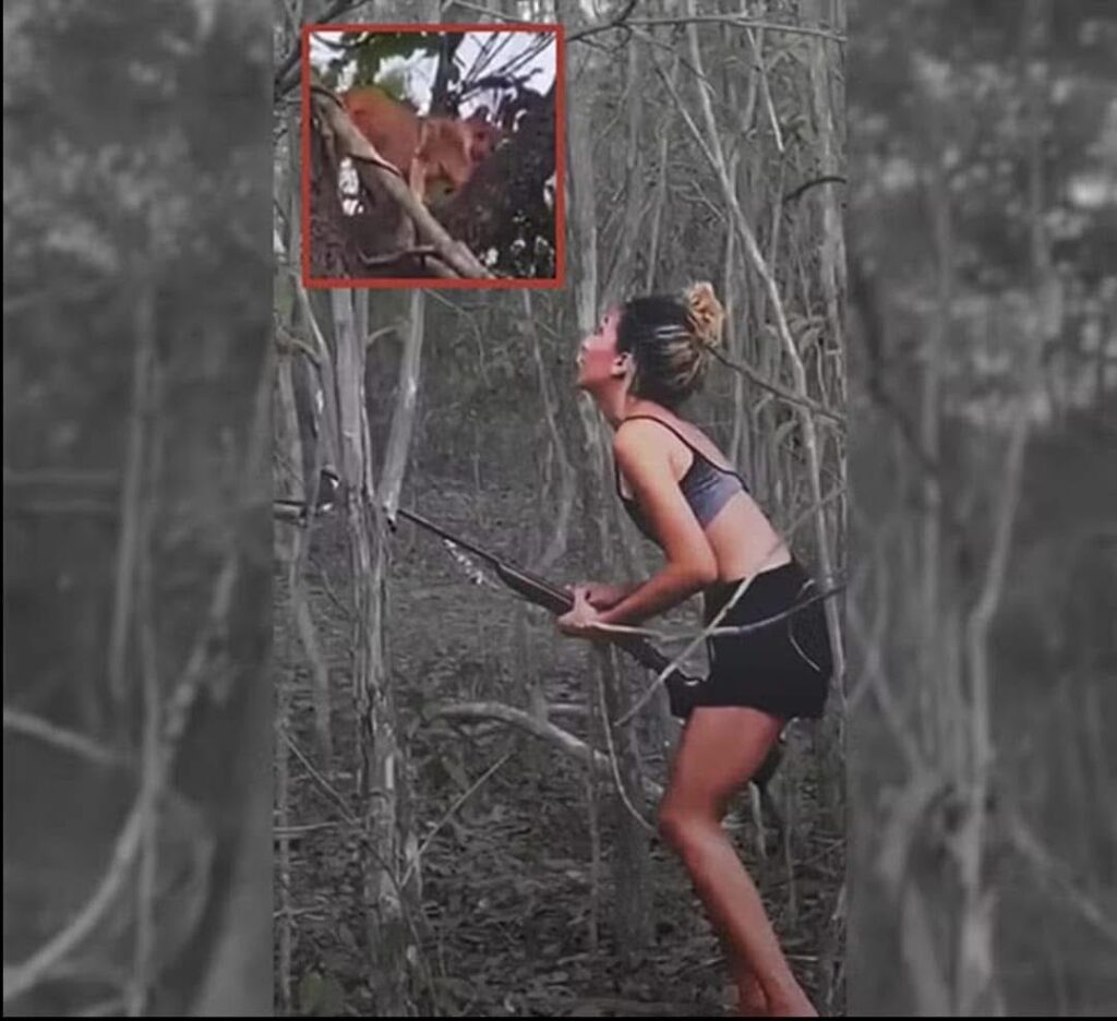 Na gravação, a mulher aparece com uma espécie de espingarda e atira no animal, que estava no alto de uma árvore.