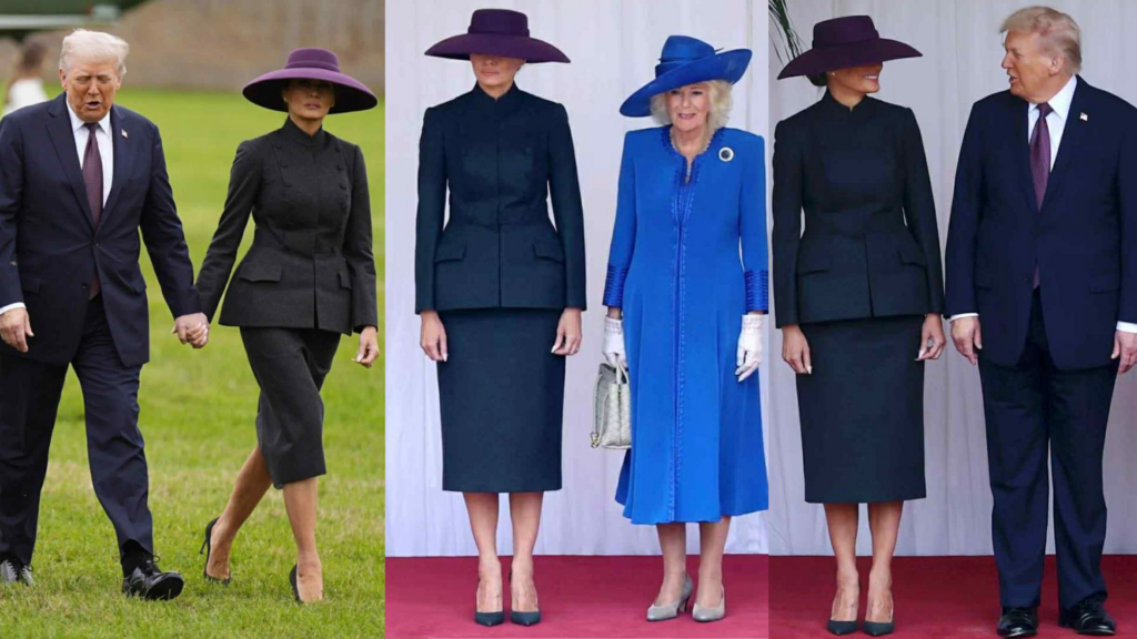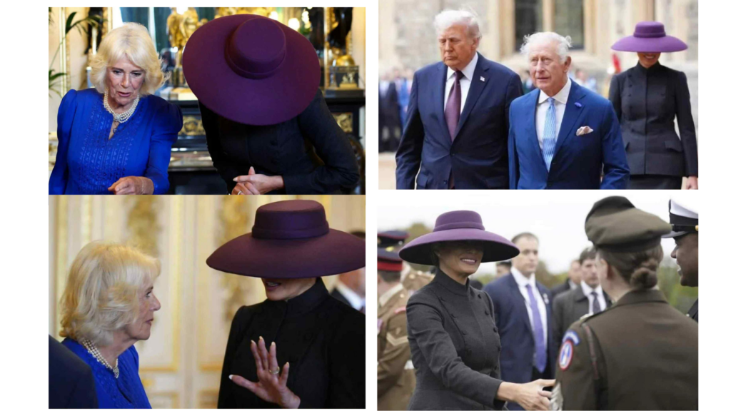 Melania Trump é mais uma vez o epítome do estilo em sua visita de Estado ao Reino Unido. O chapéu roxo representa a realeza.