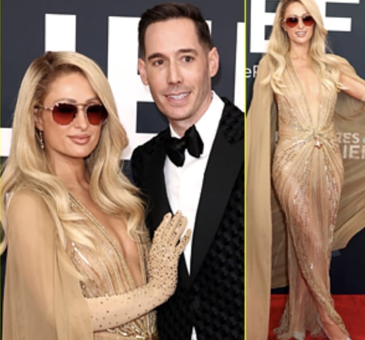 Paris escolheu um vestido Chrome Hearts com decote profundo e bordado dourado, complementado com luvas de ópera combinando, óculos de sol aviador e scarpins cristalizados. A herdeira usou suas madeixas loiras em ondas, enquanto sua apresentava um batom nude brilhante.