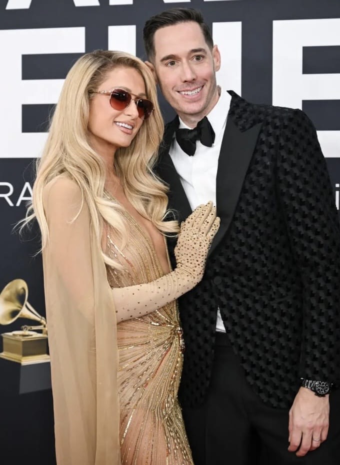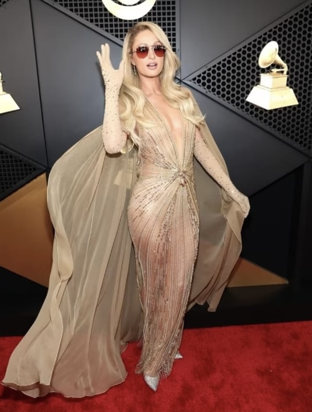 Paris Hilton brilha em vestido transparente com corações cromados e capa para o tapete vermelho do Grammy 2025