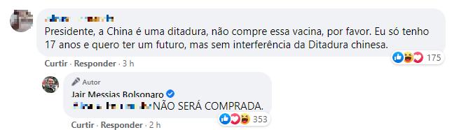 “Presidente, a China é uma ditadura, não compre essa vacina, por favor. Eu só tenho 17 anos e quero ter um futuro, mas sem interferência da ditadura chinesa”, escreveu o indivíduo. Bolsonaro respondeu: “Não será comprada.”