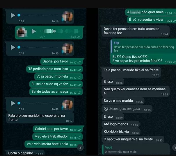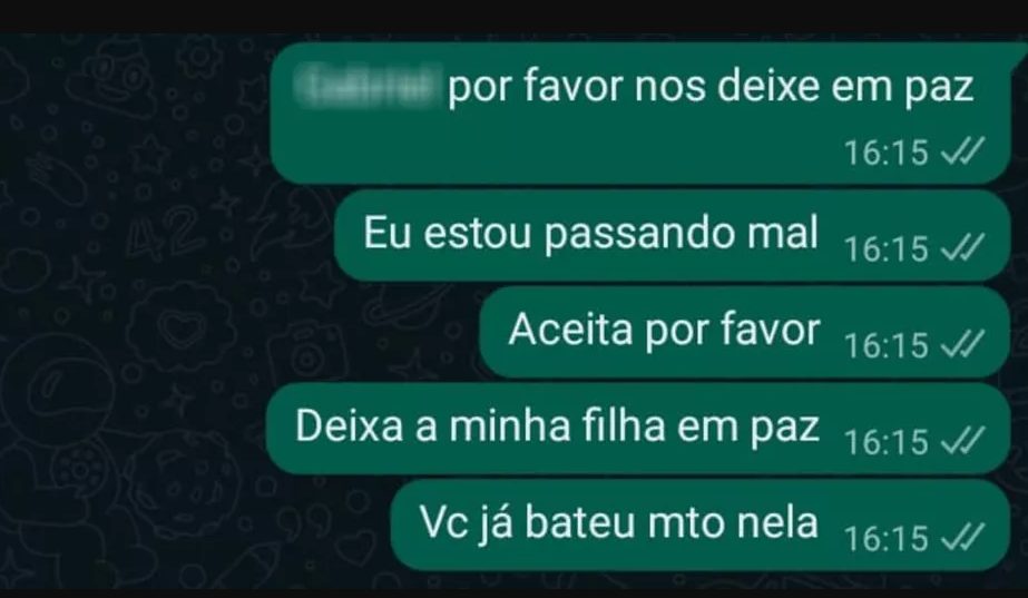 A mãe ainda tentou, por mensagens, conversar com o rapaz para que ele aceite o fim do relacionamento. Débora Velloso Moreira, mãe da menina, compartilhou alguns trechos da conversa que teve com o rapaz antes, implorando para ele aceitar o fim do relacionamento.