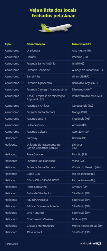 Outros 27 aeroportos e helipontos privados em todo País também foram fechados. De acordo com a Anac, a exclusão do cadastro é baseada na Resolução 158 da agência, de 13 de julho de 2010, que permite o ato administrativo quando o aeródromo ficar interditado por prazo igual ou superior a seis meses ou decorridos 180 dias do vencimento da validade da inscrição no cadastro.