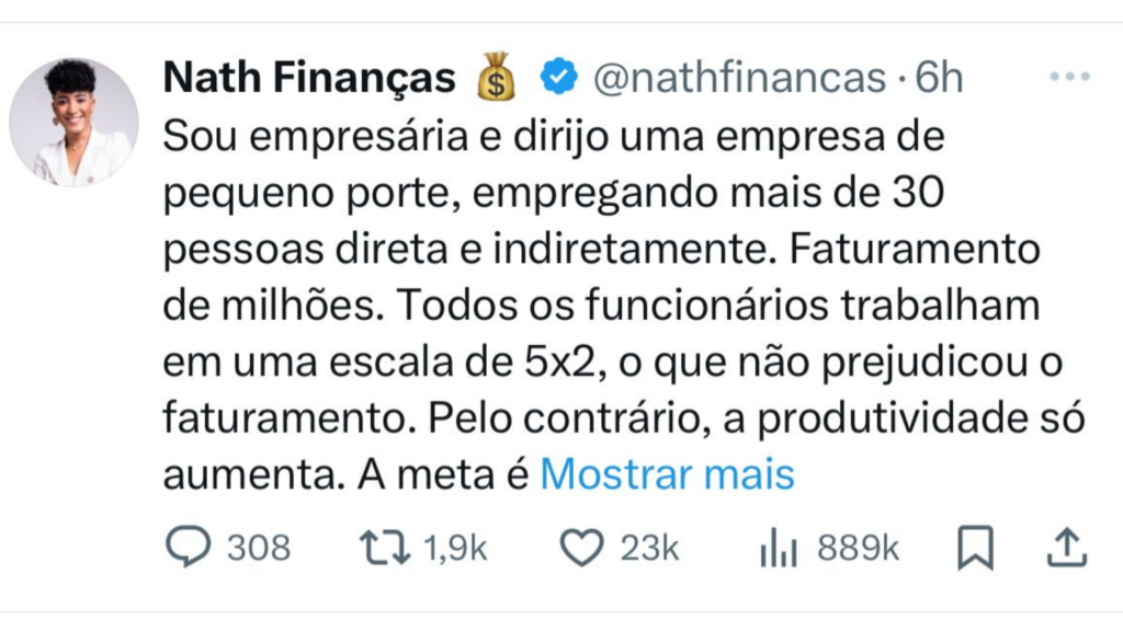 Também é possível encontrar personalidades, famosos e empresários defendendo a pauta, como é o caso de Nathália Rodrigues, conhecida como Nath Finanças, escritora especialista em finanças.
