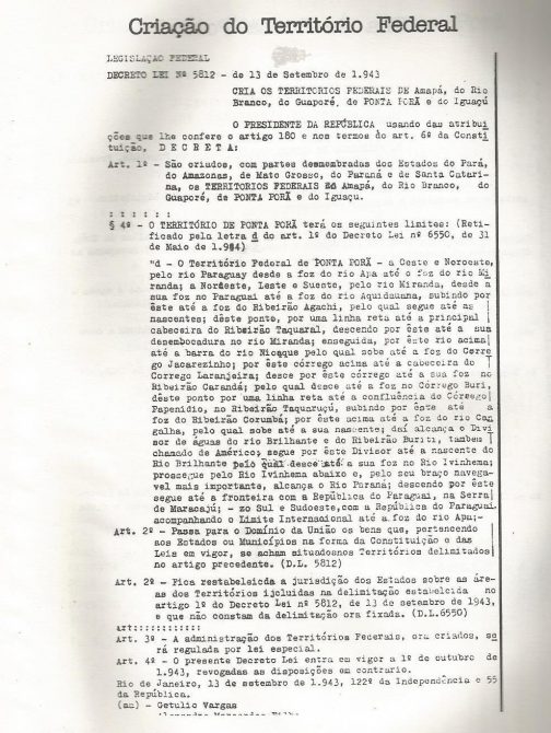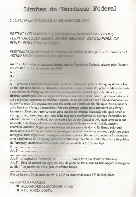 Arquivo Nacional: Cópia do documento decreto de 1944 que estabelece os limites do Território Federal de Ponta Porã.