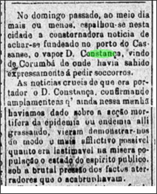 Chega ao porto de Cuiabá, por volta do meio dia, de 13 de outubro de 1889, o vapor Dona Constança, com a notícia de uma epidemia de febre amarela em Corumbá e o objetivo de buscar socorro na capital. A chegada do vapor causou um grande alvoroço na cidade, com enorme repercussão, conforme registro do órgão de imprensa da província: