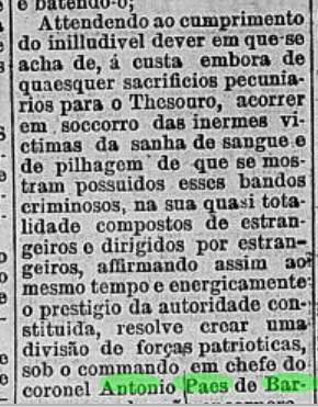 Atendendo ao cumprimento do iniludível dever em que se acha de, à custa embora de quaisquer sacrifícios pecuniários para o Tesouro, acorrer em socorro das inermes vítimas da sanha de sangue e de pilhagem de que mostram possuídos esses bandos criminosos, na sua quase totalidade compostos de estrangeiros e dirigidos por estrangeiros, afirmando assim ao mesmo tempo e energicamente o prestígio da autoridade constituída, resolve criar uma divisão de forças patrióticas, sob o comando do coronel Antonio Paes de Barros, ao qual serão incorporados os contingentes mandados aliciar por ofício reservado n. 6, de 21 de agosto, pelo coronel José Alves Ribeiro, e por ofício n.12, de 30 de setembro, pelo tenente-coronel Manuel Pedroso da Silva Rondon”.