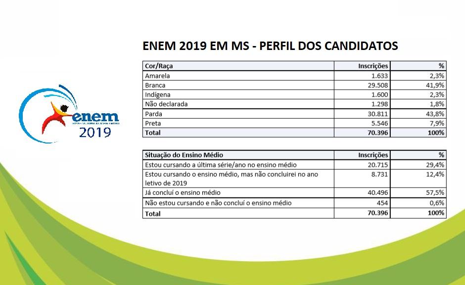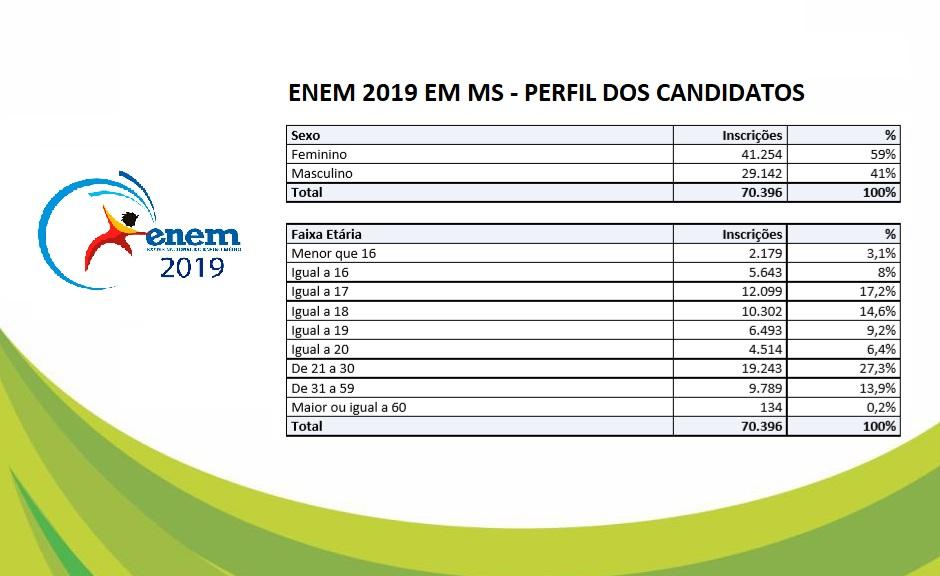 A cada dez inscritos para o Enem (Exame Nacional do Ensino Médio) em Mato Grosso do Sul, dez são de mulheres, conforme o perfil de candidatos divulgados pelo Inep (Instituto Nacional de Estudos e Pesquisas Educacionais Anísio Teixeira). O número representa 41.254 inscrições de mulheres, 59% do total – os 41% restantes representam uma população de 29.142 homens.