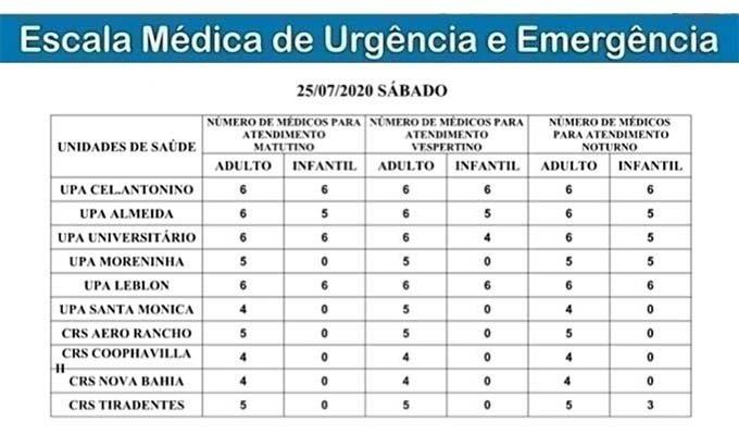 A escala médica montada pela Sesau (Secretaria Municipal de Saúde) para as UPAs (Unidade de Pronto Atendimento) e CRSs (Centros Regionais de Saúde) de Campo Grande para o plantão deste sábado (25) prevê um total de 228 médicos, distribuídos em 3 turnos, para atendimento adulto e pediátrico. O serviço infantil, como é padrão, será concentrado em 4 unidades durante o dia e em 6 à noite.