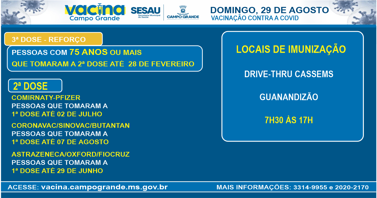 Conforme calendário divulgado pela Sesau (Secretaria Municipal de Saúde), os públicos deste domingo são idosos com ou acima de 75 anos que tomaram a segunda dose até o dia 28 de fevereiro. E 2ª dose para quem tomou o imunizante da Pfizer até o dia 2 de julho; Coronavac, até 7 de agosto; e Astrazeneca, até 29 de junho.