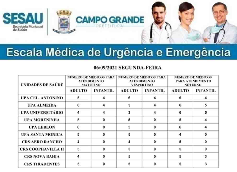 Campo Grande possui quatro CRS, localizados nos bairros Coophavila II, Aero Rancho, Tiradentes, Nova Bahia. Há seis UPAs nos bairros, localizadas no Leblon, Coronel Antonino, Moreninha II, Universitário, Vila Almeida e Santa Mônica. Veja abaixo a escala de plantão de médicos para esta segunda-feira: