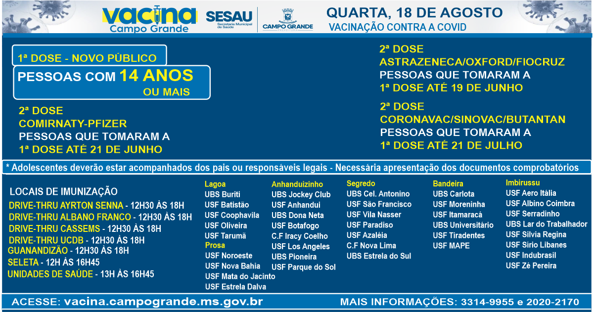 Campo Grande continua a vacinação contra o coronavírus para adolescentes nesta quarta-feira (18). Desta vez, a imunização é para pessoas a partir dos 14 anos de idade. Também haverá aplicação da segunda dose das vacinas.