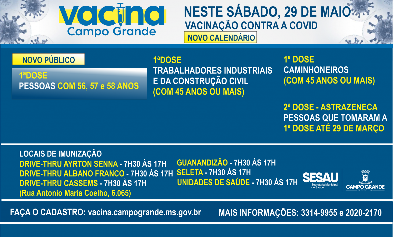 Campo Grande ampliou, neste sábado (29), o público para vacinação contra covid e incluiu pessoas com 56 anos sem comorbidades. A imunização continua para pessoas com 57 e 58 sem comorbidades e para os públicos prioritários.
