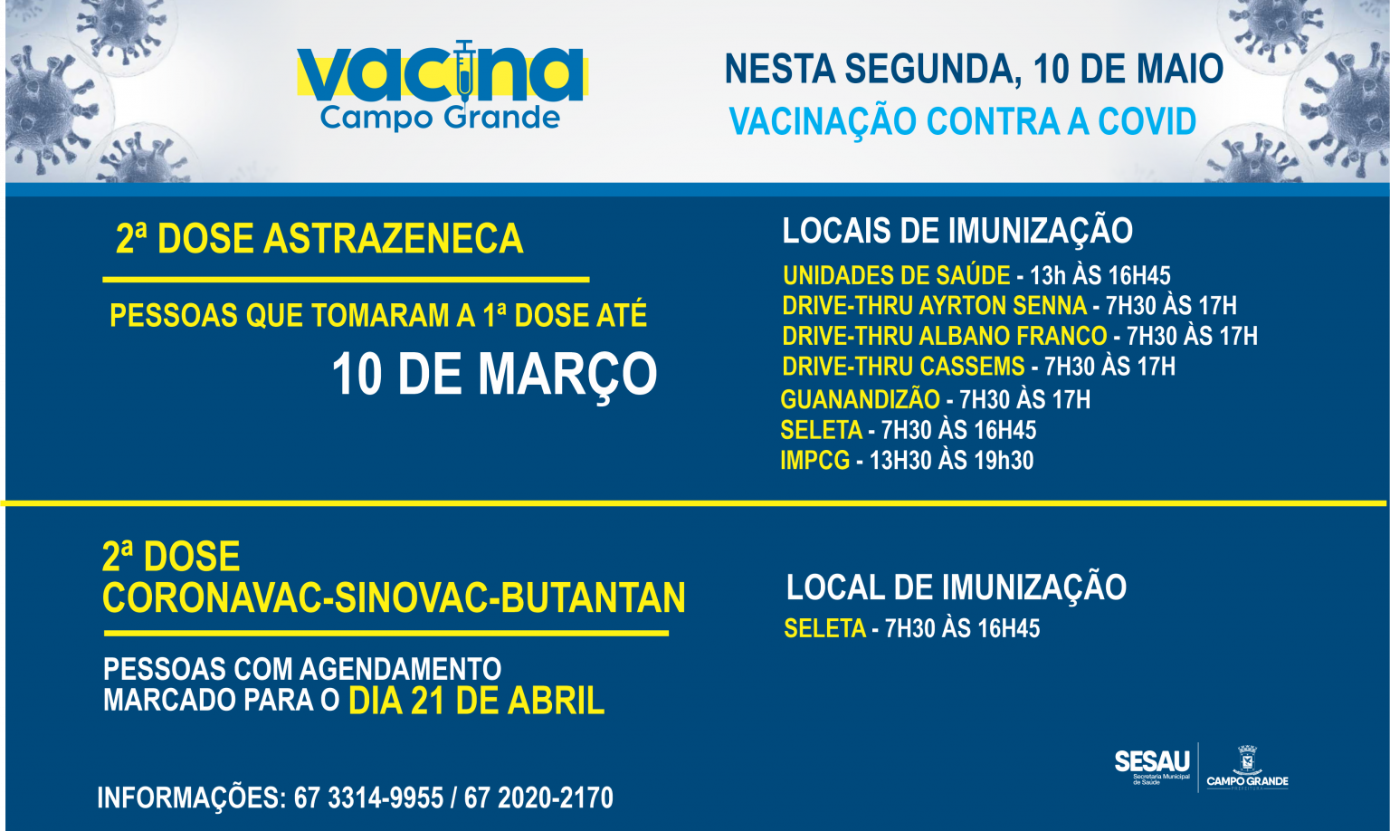 A Sesau (Secretaria Municipal de Saúde) de Campo Grande continua, nesta segunda-feira (10), com a aplicação da 2ª dose das vacinas AstraZeneca e da CoronaVac. Confira abaixo os locais de vacinação para cada um dos grupos.