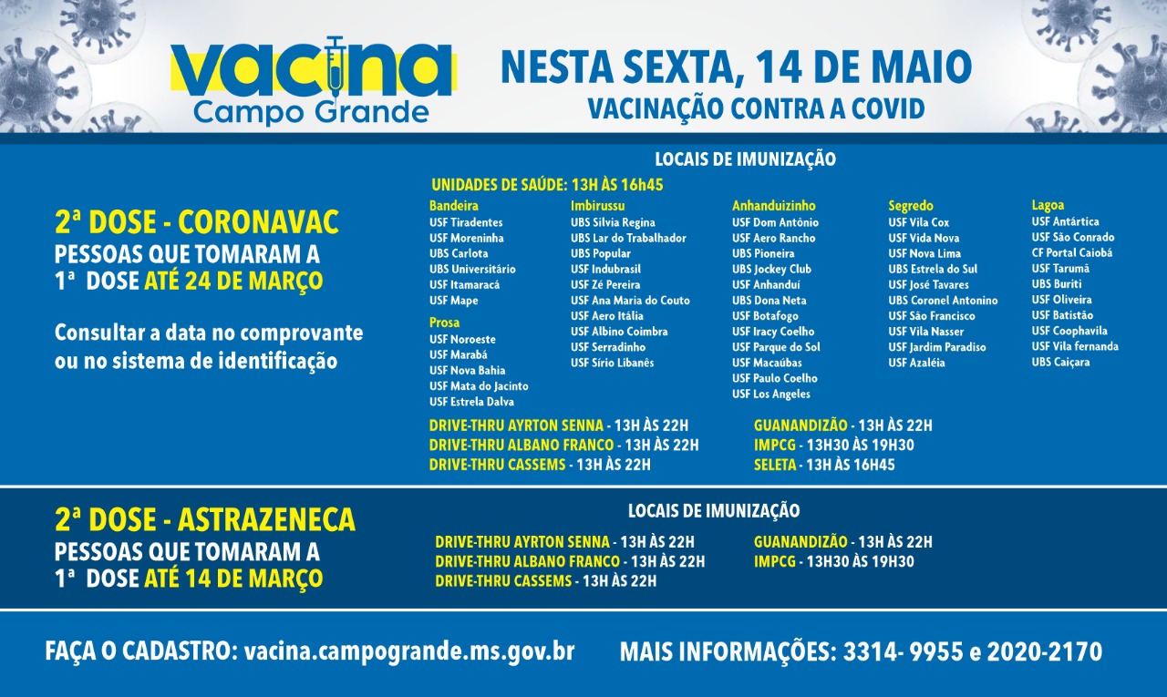A vacinação contra covid em Campo Grande nesta sexta-feira (14) será destinada à aplicação da 2ª dose da CoronaVac e da AstraZeneca. Os pontos de imunização irão funcionar a partir de 13h, com atendimento para pessoas que tomaram a primeira dose de Coronavac-Sinovac-Butantan até o dia 24 de março e pessoas que tomaram a primeira dose de Astrazeneca-Oxford-Fiocruz até o dia 14 de março.