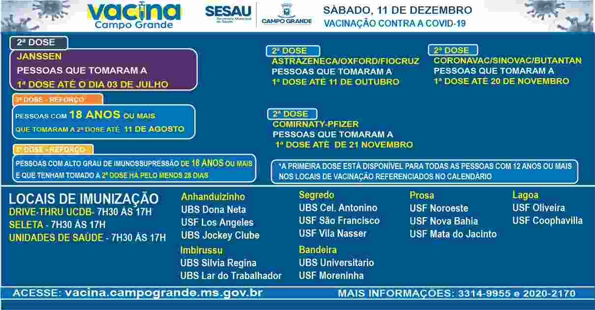 Campo Grande contará com mais de 10 locais de vacinação ao longo do sábado (11) para que as pessoas possam se imunizar contra a Covid-19. Estão disponíveis a primeira, segunda e terceira doses.
