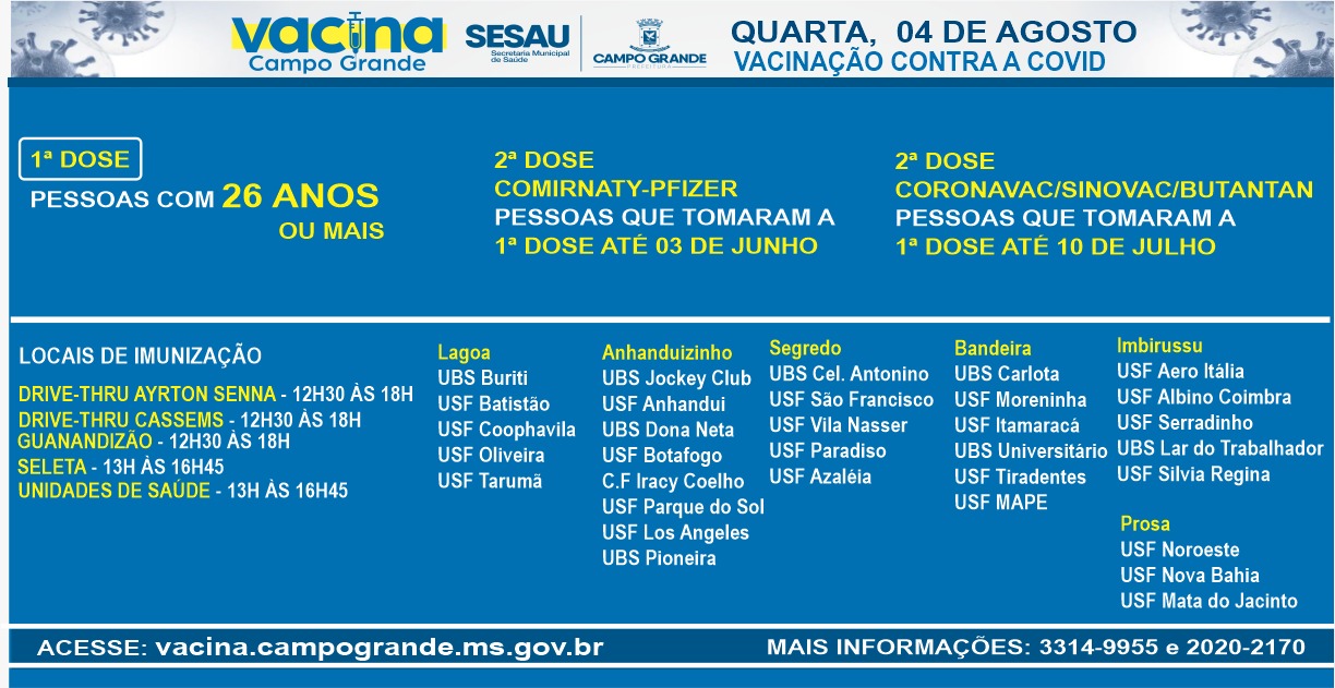 Nesta quarta-feira (4), Campo Grande continua vacinação contra Covid-19 em pessoas a partir de 26 anos. Além disso, na cidade são aplicadas as segundas doses da Coronavac e Pfizer.