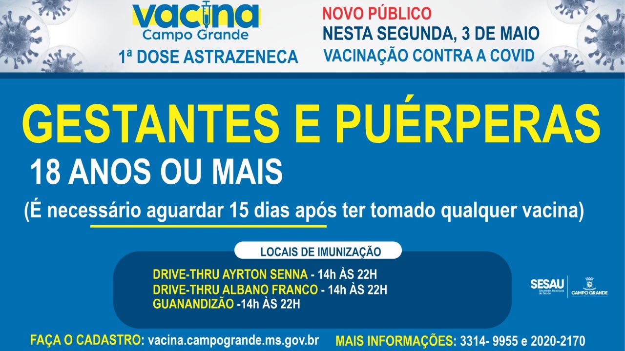 Nesta segunda-feira, o município amplia os locais de vacinação e abre as unidades de saúde para receber esse público. Assim, serão 54 postos de saúde reforçando a aplicação das doses. Além disso, os drives do Albano Franco, Ayrton Senna e da Cassems continuam vacinando, bem como no IMPCG e na Seleta.