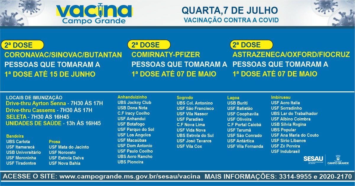 Sem novas doses para ampliar a campanha por faixa etária, Campo Grande aplica somente a 2ª dose da vacina contra o coronavírus nesta quarta-feira (7). Pessoas que tomaram a Coronavac, AstraZeneca e Pfizer poderão comparecer aos drive-thrus e unidades de saúde para completar a imunização.