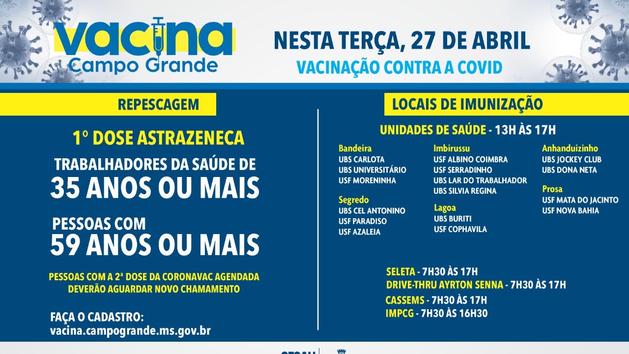 Campo Grande segue nesta terça-feira (27) com a vacinação de pessoas com 59 anos ou mais e trabalhadores da saúde a partir de 35 anos. Assim, a imunização deste público pode ser feita das 13h às 17h em 20 pontos de vacinação. Confira abaixo todos os locais para receber a dose.