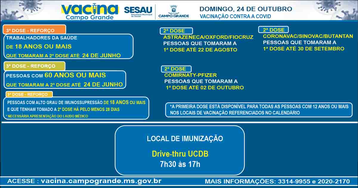 Campo Grande disponibiliza a 1ª, 2ª e 3ª dose da vacina contra a covid neste domingo (23). Porém, a imunização será realizada somente no drive-thru da UCDB (Universidade Católica Dom Bosco), das 7h30 às 17h, mas será uma oportunidade para quem ainda não tomou a vacina ou que está com a dose atrasada.