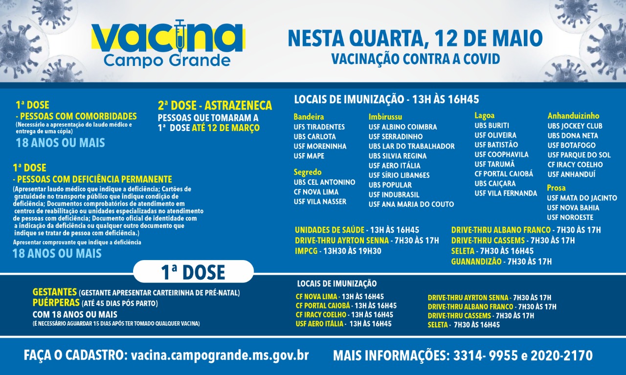 Campo Grande ganha novos pontos de vacinação nesta quarta-feira (12). Além dos drives, polos e unidades de saúde, a imunização também será realizada nas três Clínicas da Família e em uma unidade de saúde da família.