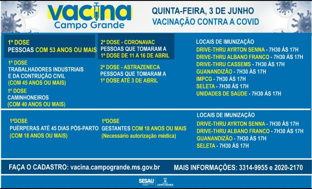 Nesta quinta-feira (3), Campo Grande amplia a vacinação contra a Covid-19 para pessoas com 53 anos ou mais. Além disso, retoma a aplicação da segunda dose de Coronavac para vacinados com a primeira dose entre os dias 11 e 16 de abril.