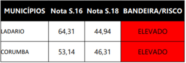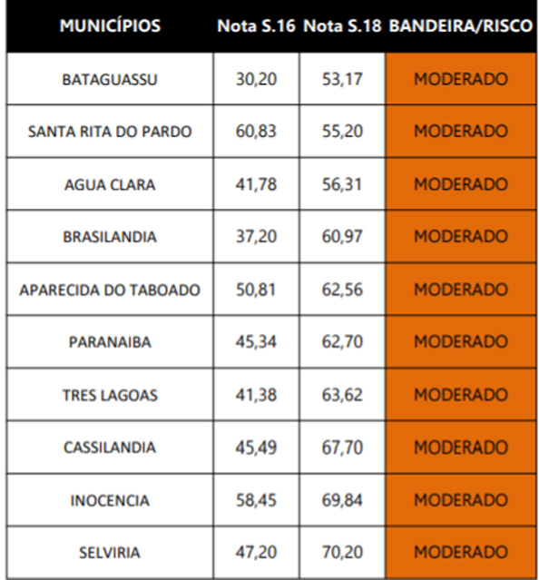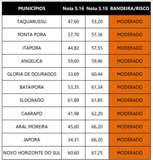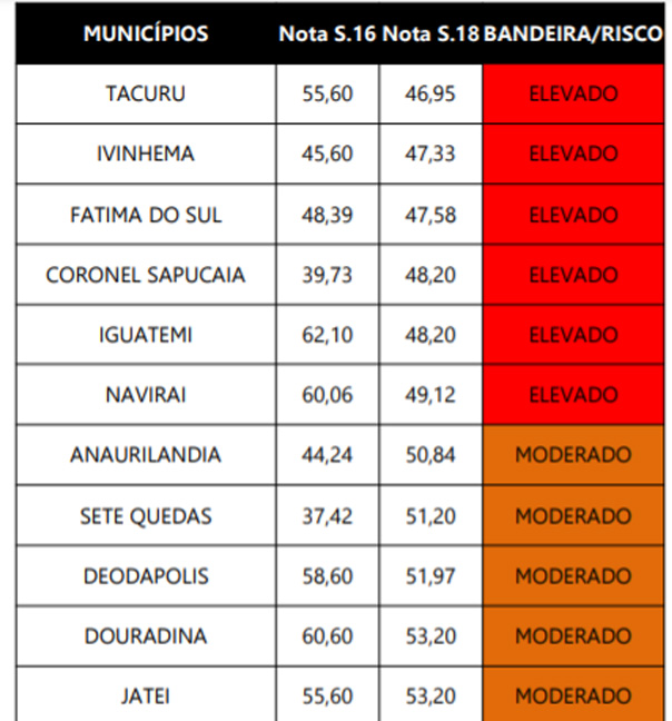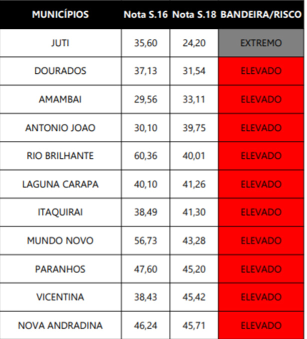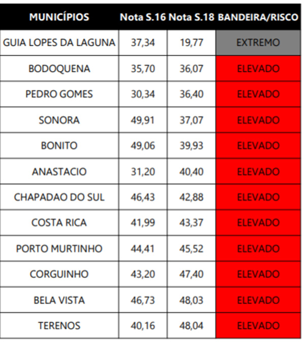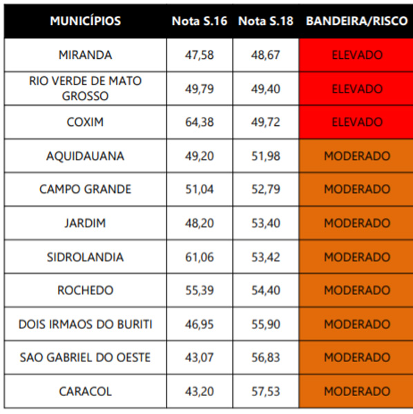 Conforme o relatório, duas cidades de MS apresentam risco extremo para contaminação do coronavírus e terão toque de recolher a partir das 20h: Juti e Guia Lopes da Laguna. Por outro lado, a melhor classificação do Estado fica por conta de Nioaque, que tem classificação de bandeira amarela, que é de risco tolerável e também terá restrição de circulação de pessoas a partir das 22h.