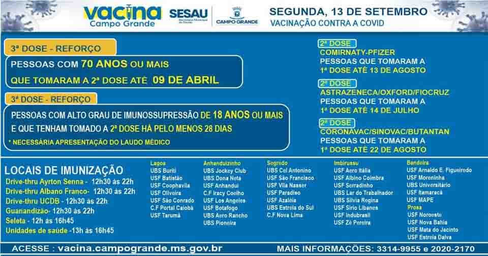 Campo Grande segue com aplicação de 2ª e 3ª dose da vacina contra covid nesta segunda-feira (13) em 44 locais de imunização.