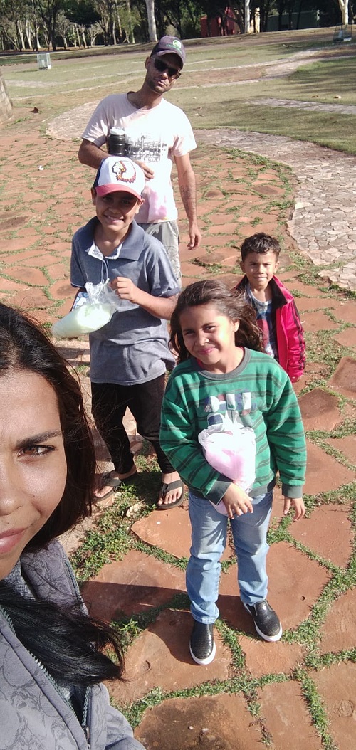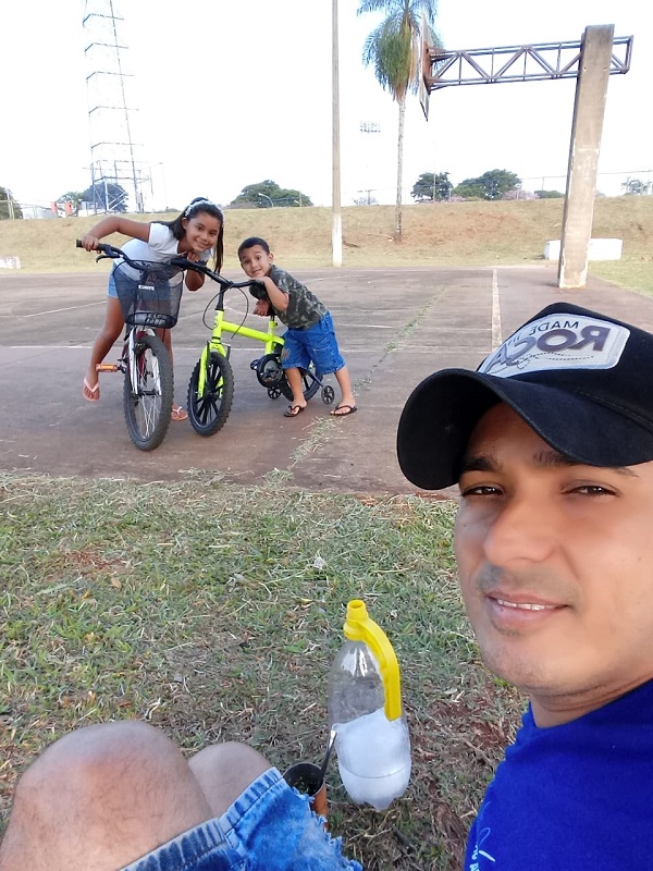 Esse é o Alexandre Barbosa do Nascimento, junto com os filhos, Agatha, de 8 anos, e o Arthur, de 4. Eles fizeram essa selfie durante um passeio no Parque Ayrton Senna, onde amam andar de bicicleta, jogar bola e tomar tereré.