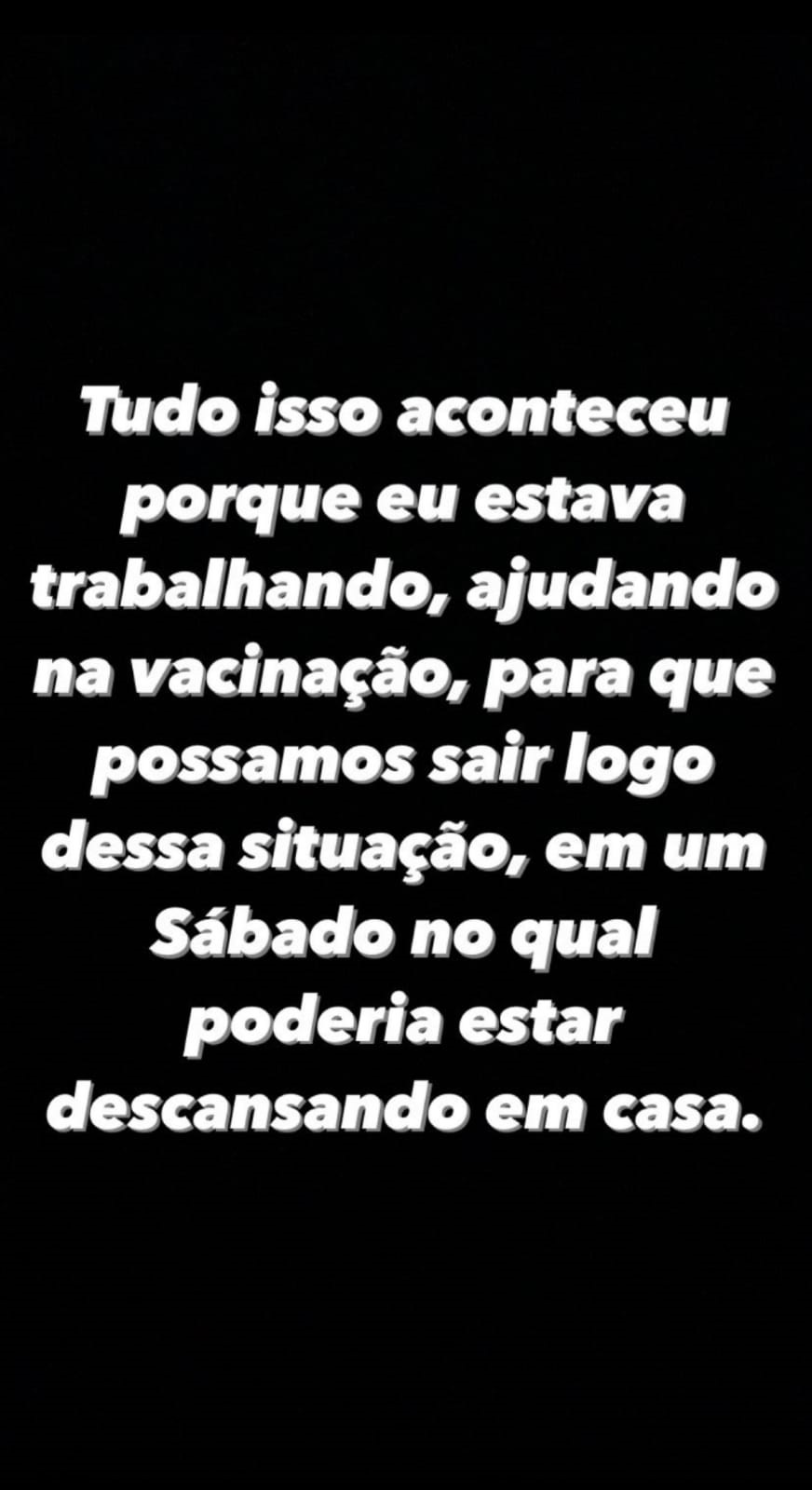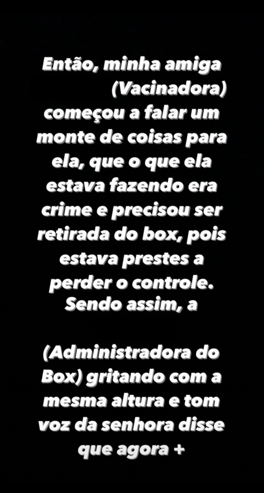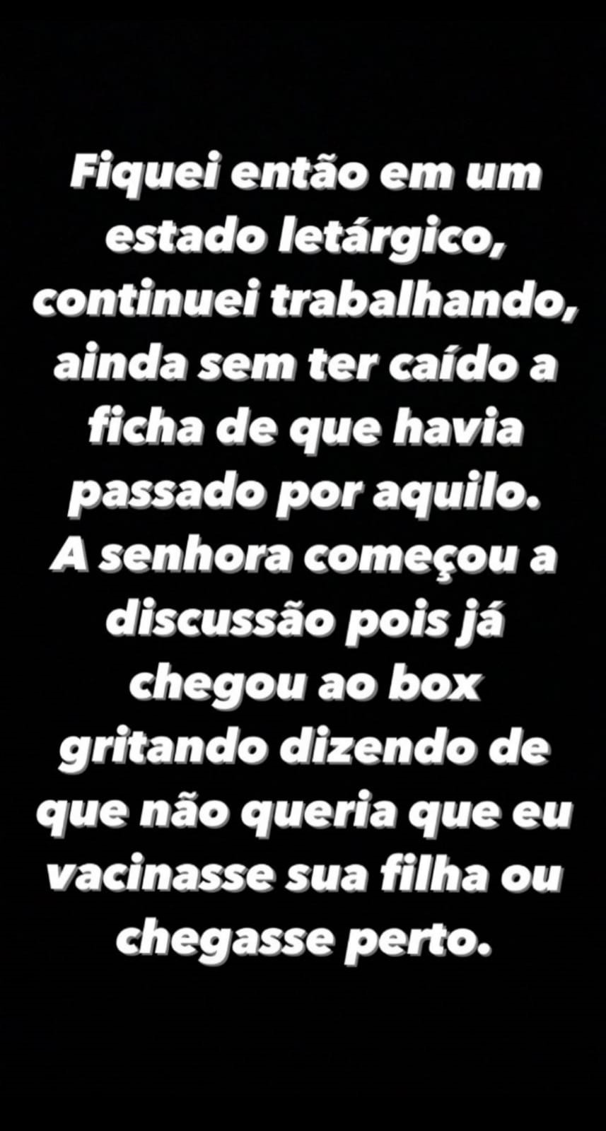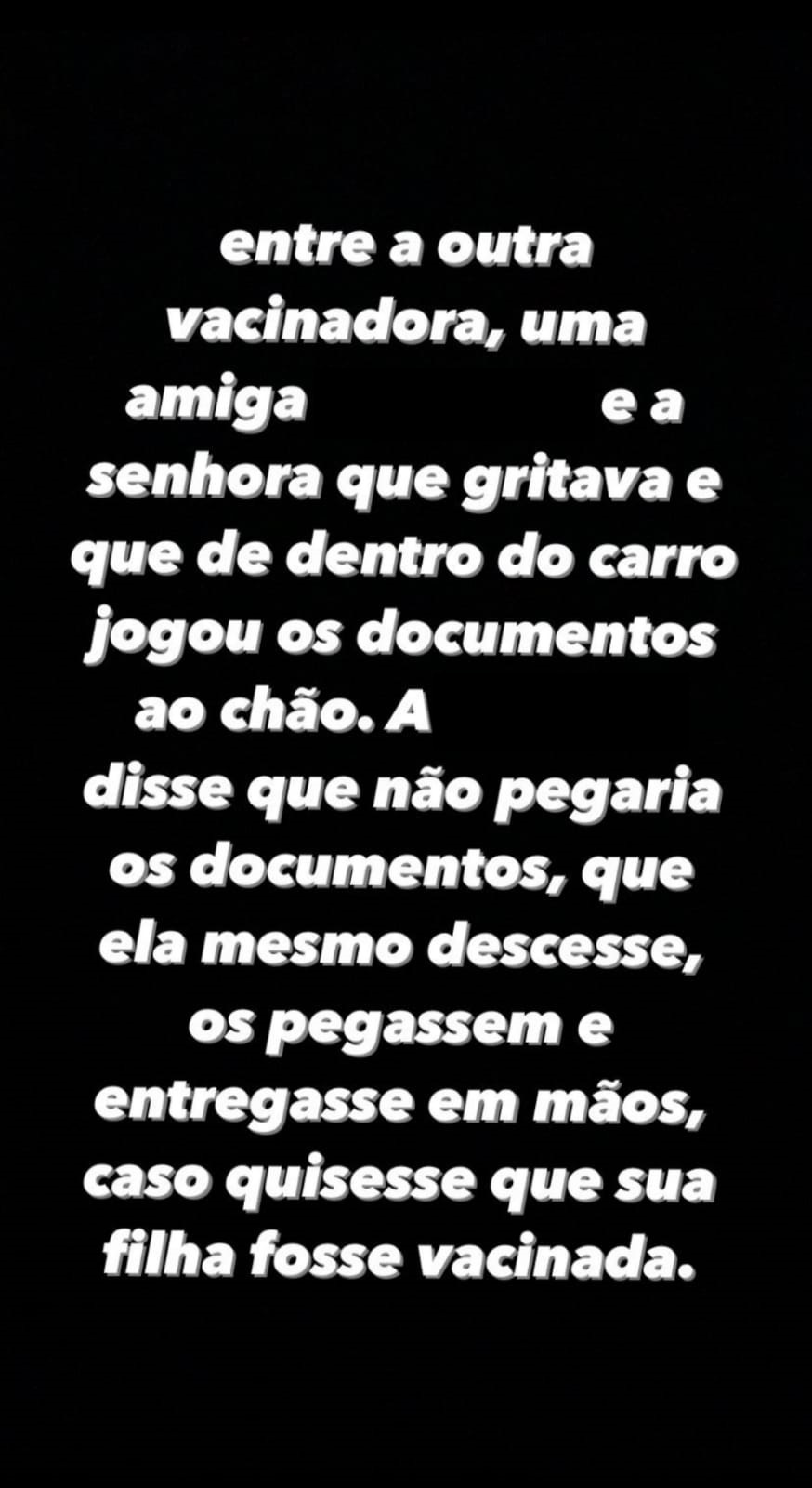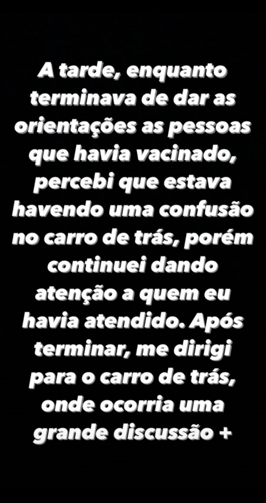 “A tarde, enquanto terminava de dar as orientações as pessoas que haviam vacinado, percebi que estava havendo uma confusão no carro de trás, porém continuei dando atenção a quem eu havia atendido. Após terminar, me dirigi para o carro de trás, onde ocorrida uma grande discussão”.