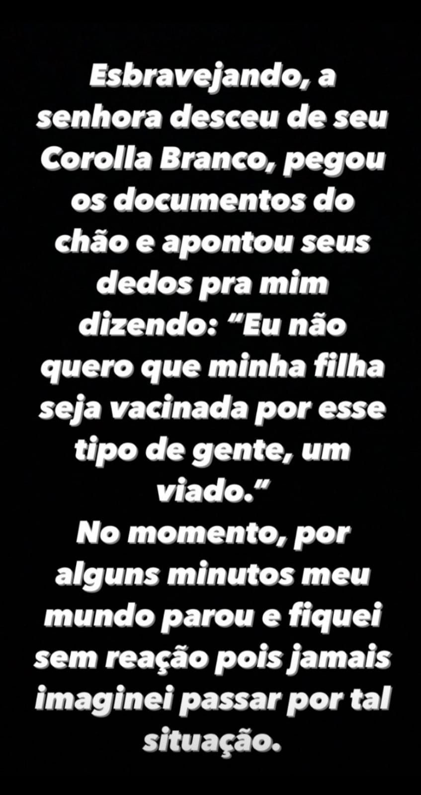“Esbravejando, a senhora desceu de seu Corolla Branco, pegou os documentos do chão e apontou seus dedos para mim dizendo: “Eu não quero que minha filha seja vacinada por esse tipo de gente, um viado”.