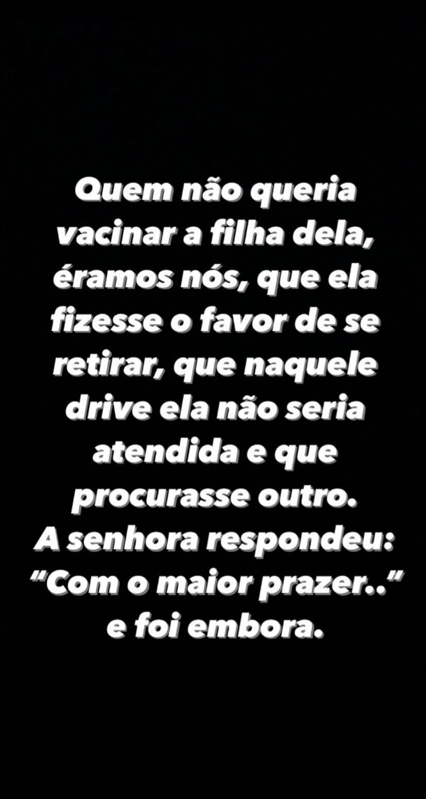 “A Secretaria Municipal de Saúde (Sesau) manifesta o seu mais profundo repúdio a episódio de homofobia ocorrido no sábado, dia 21 de agosto, no drive de vacinação Albano Franco. Na ocasião, uma mulher teria usado de termo pejorativo e homofóbico ao se referir a um profissional de saúde e se opôs que o mesmo vacinasse sua filha adolescente. Ela deixou o local sem que a filha recebesse o atendimento”, escreveu.