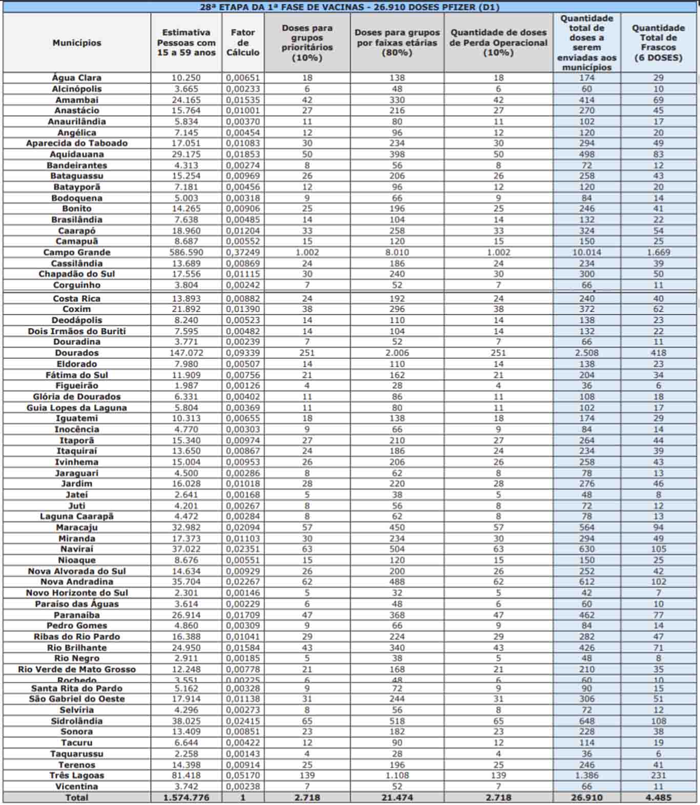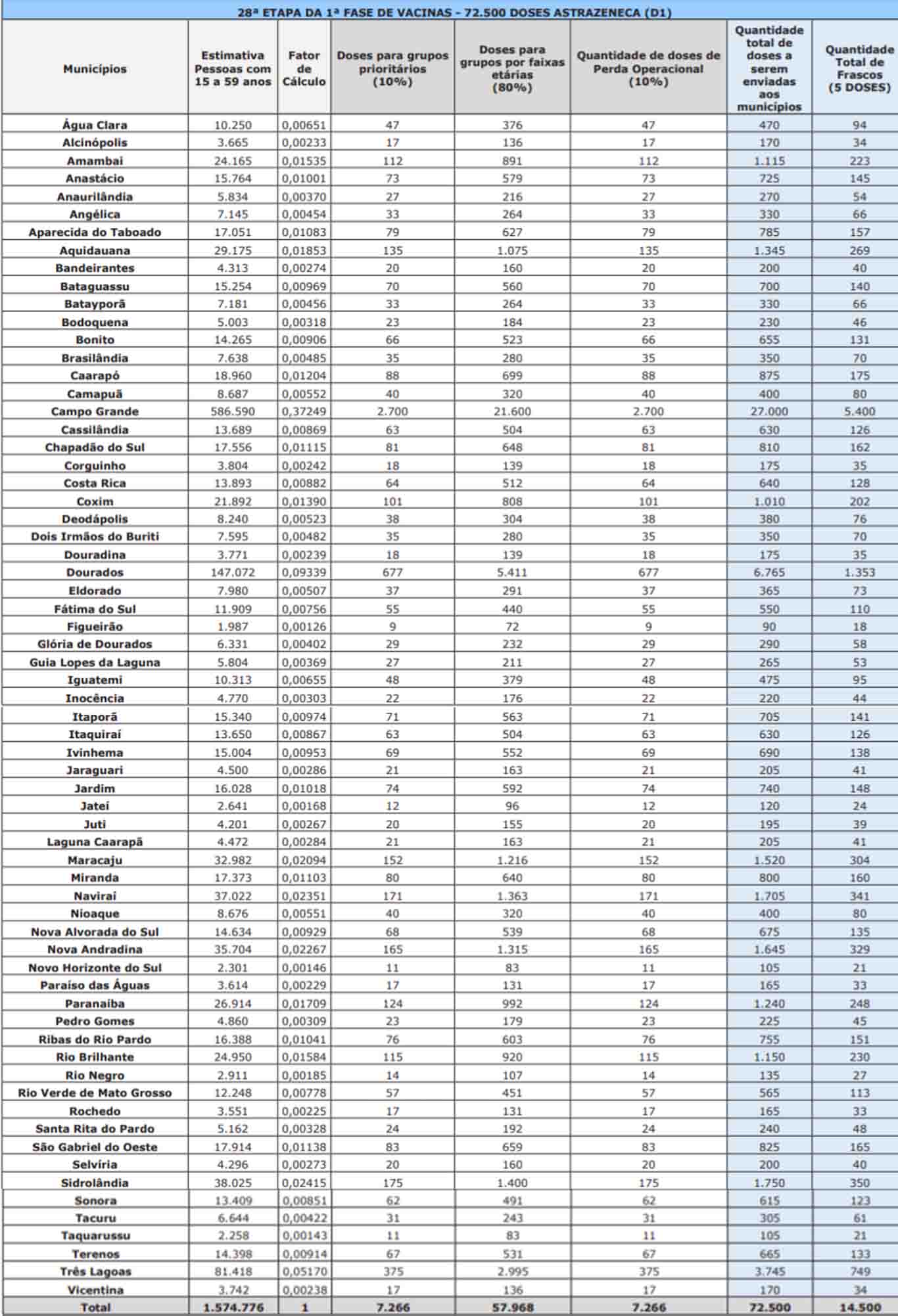 Vale ressaltar que, com as doses para vacinação em massa de todos os adultos dos municípios de fronteira, as outras doses serão divididas entre 66 cidades, cabendo a cada uma porcentagem maior na divisão, conforme as tabelas abaixo, confira: