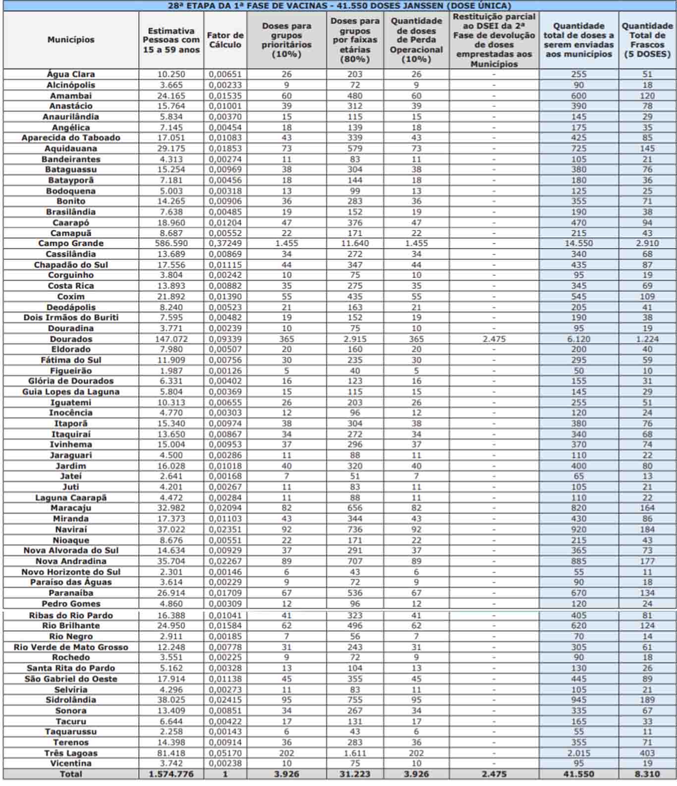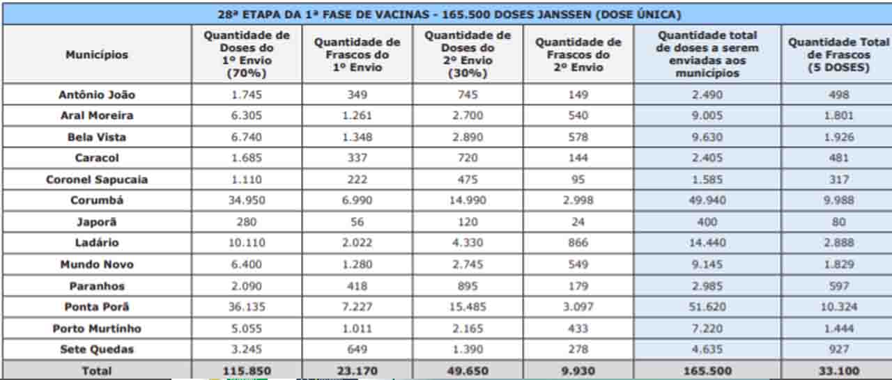 Assim, a SES (Secretaria Estadual de Saúde) publicou em Diário Oficial o quantitativo que cada município vai receber. No quantitativo, está listada a distribuição de 165.500 doses de aplicação única da Janssen que irão para 13 cidades da fronteira para estudo epidemiológico. O envio será feito em duas etapas, sendo a 1ª 70% do total e o restante num segundo momento por questões de logística e armazenamento.