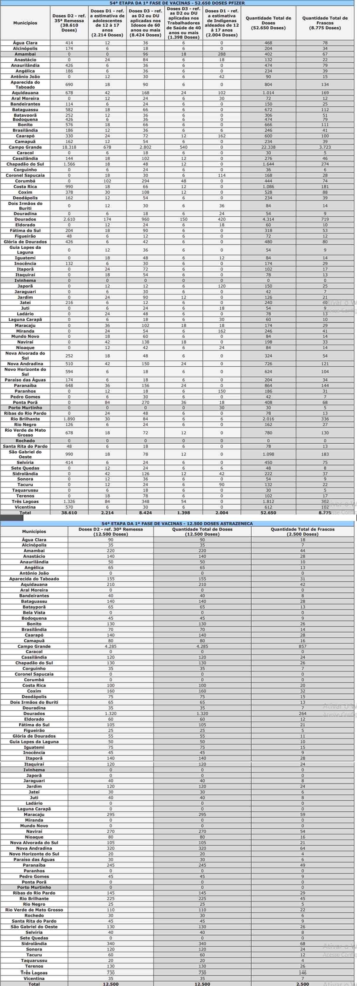 A SES-MS (Secretaria de Estado de Saúde) publicou a distribuição de 65.150 doses de vacina contra covid, sendo 52.650 doses da Pfizer e 12.500 da AstraZeneca para os municípios de Mato Grosso do Sul.